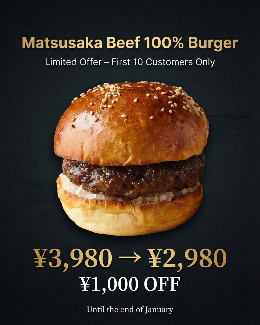 Limited to just 5 lucky guests per day — upgrade your Kuroge Wagyu burger to world-famous Kobe Beef at no extra charge!This is your chance to experience one of the world’s most luxurious wagyu burgers, absolutely free.Available for a limited time only and while supplies last.🟡 Simply order a Kuroge Wagyu burger🟡 Show this screen to our staff to receive your free upgrade